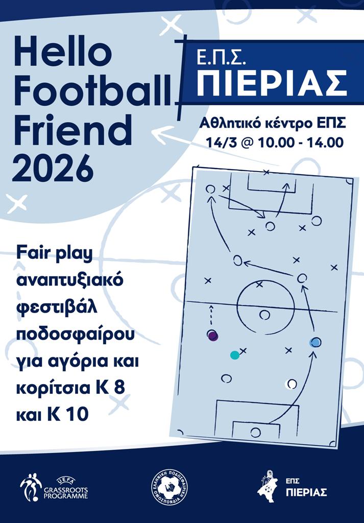 ΕΠΣ ΠΙΕΡΙΑΣ Κλήση Κ-13 για ΠΕΜΠΤΗ 26-02-2026, ώρα 16:00 ΗΛΙΚΙΑ 2013 Καλούνται οι παρακάτω ποδοσφαιριστές να βρίσκονται στο Αθλητικό κέντρο της Ε.Π.Σ. Πιερίας στην Ν. Έφεσο την ΠΕΜΠΤΗ 26-02-2026 και ώρα 16:00 Σε περίπτωση αδυναμίας να ειδοποιηθεί ο προπονητής Κος Μιχωλός Δημήτριος στο τηλ. 6948866980....