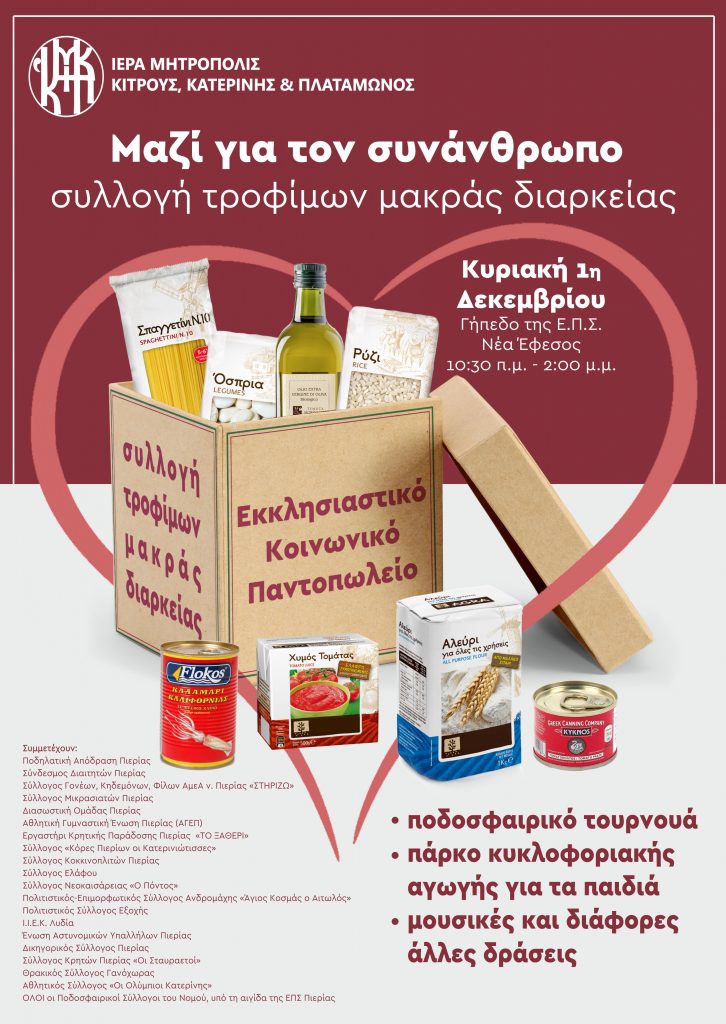 Στα πλαίσιο της ηθικής και υλικής υποστήριξης των οικονομικώς ασθενέστερων πολιτών και με γνώμονα την αγάπη και την αλληλεγγύη, εν όψει της Εορτής των Χριστουγέννων, όλοι οι παραπάνω σύλλογοι και φορείς θα προβούν σε συλλογή τροφίμων μακράς διάρκειας, τα οποία θα διανεμηθούν μέσω του Κοινωνικού Παντοπωλείου της Ιεράς Μητροπόλεως Κίτρους και των Ενοριακών Παραρτημάτων του στις εκατοντάδες άπορες οικογένειες της Πιερίας, τα μοναχικά και τα ηλικιωμένα άτομα που εξυπηρετεί.